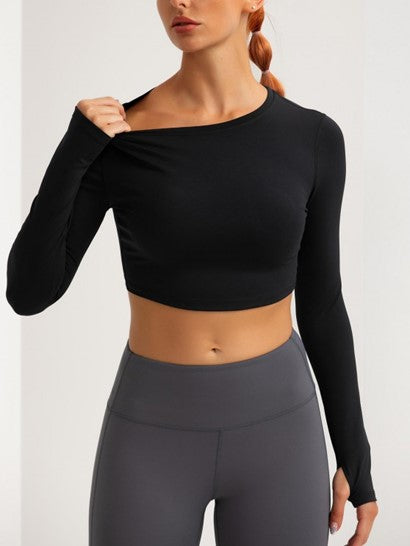 Solid Color Basic Sports Crop Top With Thumb Hole